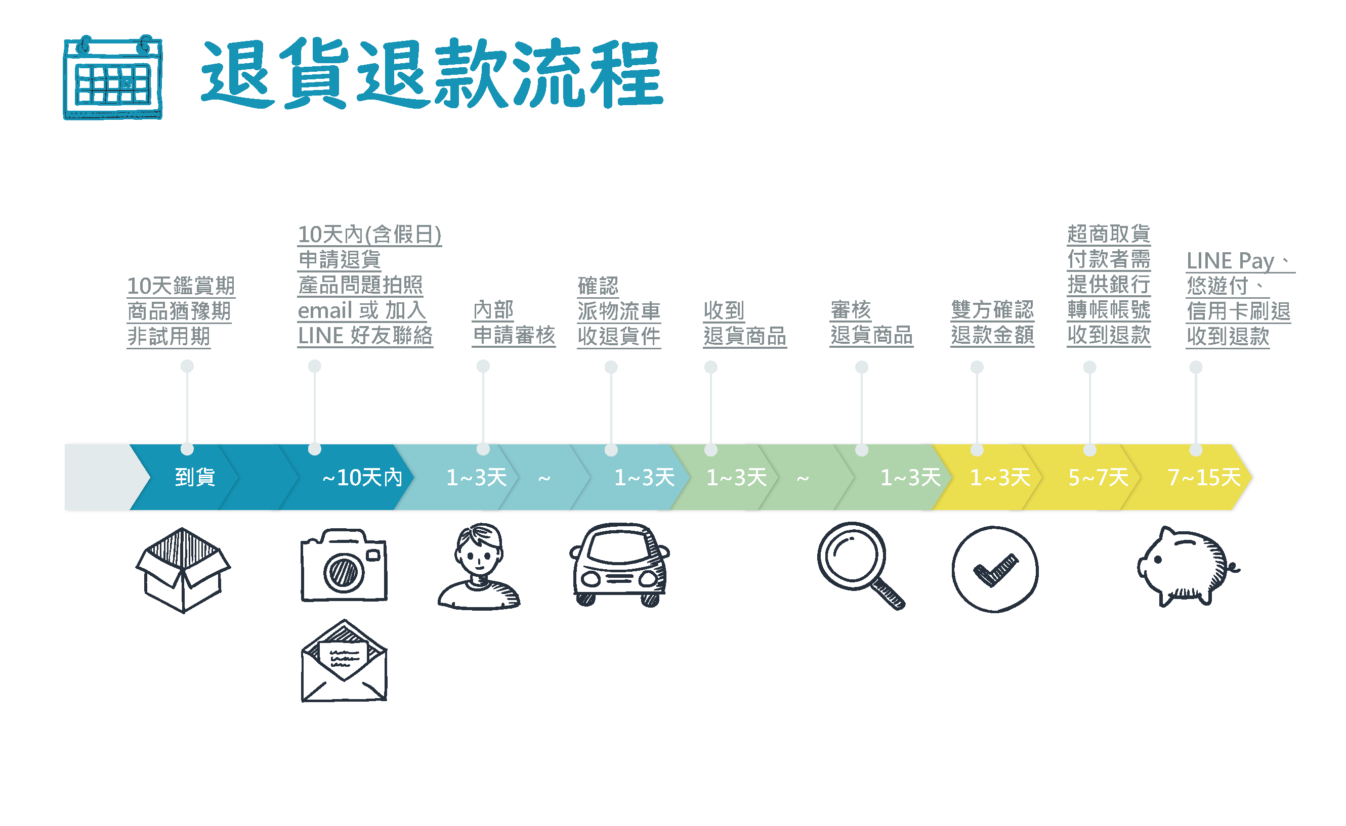 - LINE Pay 或是 悠遊付 付款者: 除了 LINE pay 商店執行端的作業時間,此流程還包括後續收單銀行及發卡銀行處理,因為發卡銀行無法即時看到取消紀錄,信用卡額度及簽帳金融卡帳戶餘額也無法即時歸還,所以在您收到退款前,一般約需7至15個工作日 (實際時程依發卡銀行處理為準),請耐心等候。